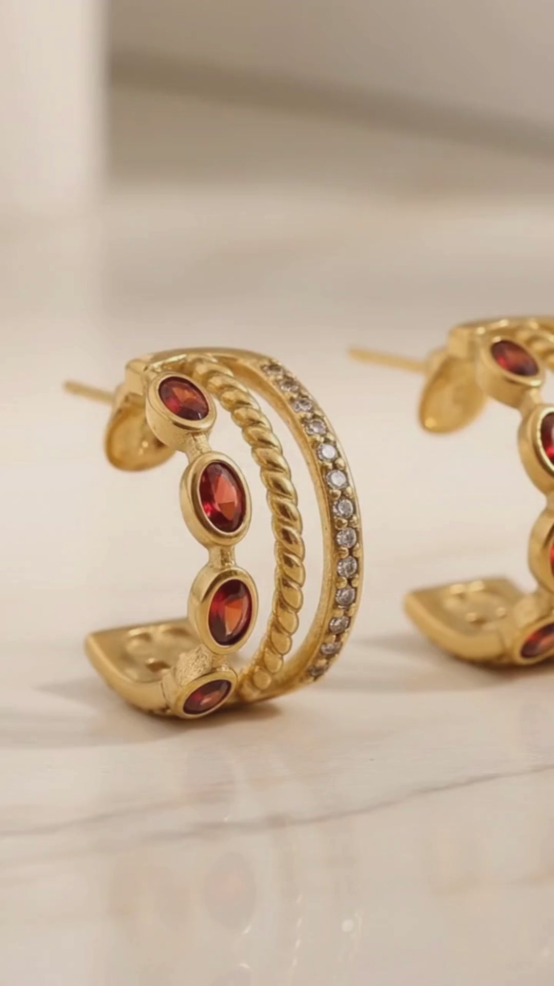 Bold, layered, and effortlessly elevated — these 18K gold triple hoop earrings feature rich oval-cut garnet stones paired with shimmering cubic zirconia accents for a dimensional, luxury-inspired look.
